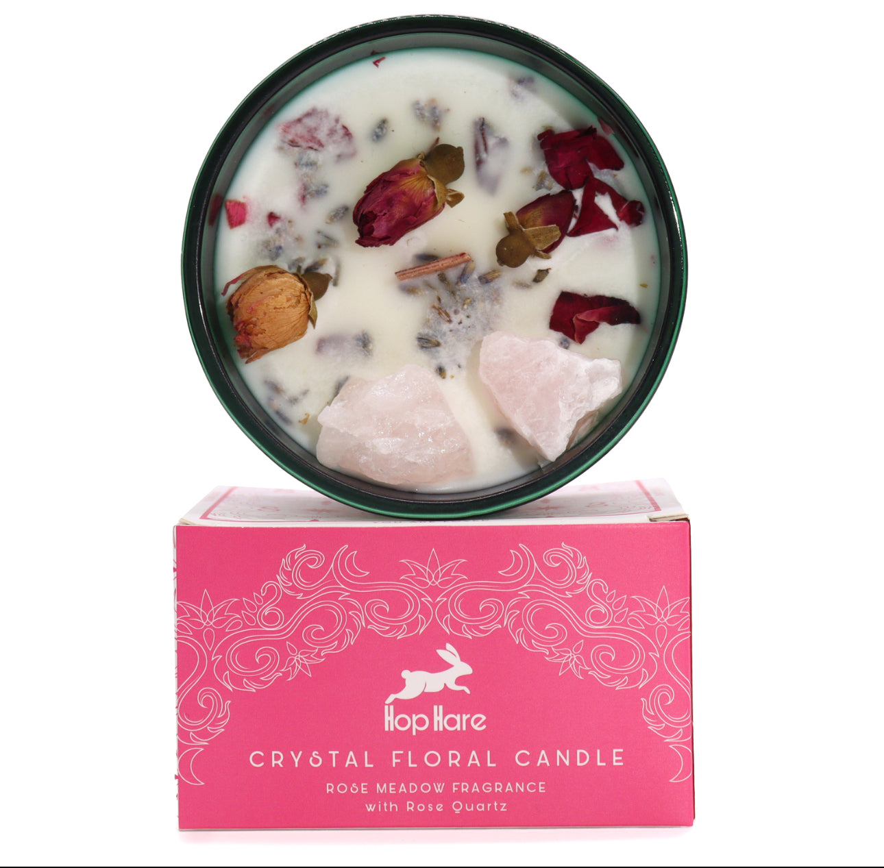 Kiekviena „Hop Hare" krištolo magijos žvakė yra tikras šedevras – įdėta į elegantišką tamsiai žalią stiklinį indą. Atskleiskite viduje slypinčią magiją, atrasdami kristalą, apibarstytą smulkesnių kristalų drožlėmis ir subtiliais sausais žiedais – tikrą gamtos stebuklų kompoziciją.