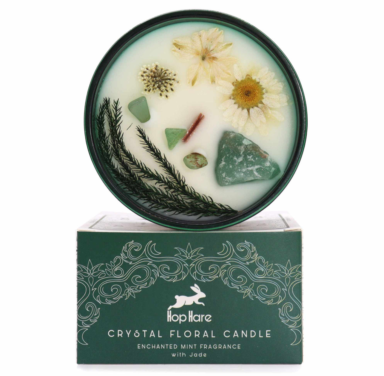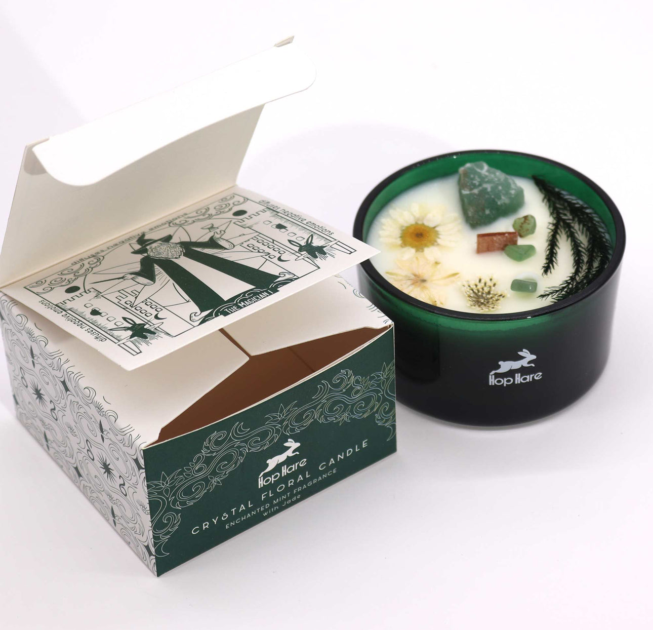 Kiekviena „Hop Hare" krištolo magijos žvakė yra tikras šedevras – įdėta į elegantišką tamsiai žalią stiklinį indą. Atskleiskite viduje slypinčią magiją, atrasdami kristalą, apibarstytą smulkesnių kristalų drožlėmis ir subtiliais sausais žiedais – tikrą gamtos stebuklų kompoziciją.