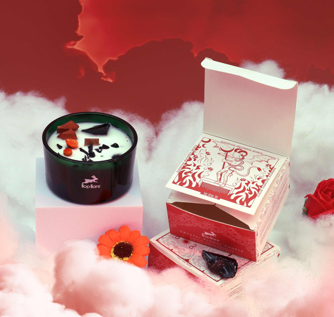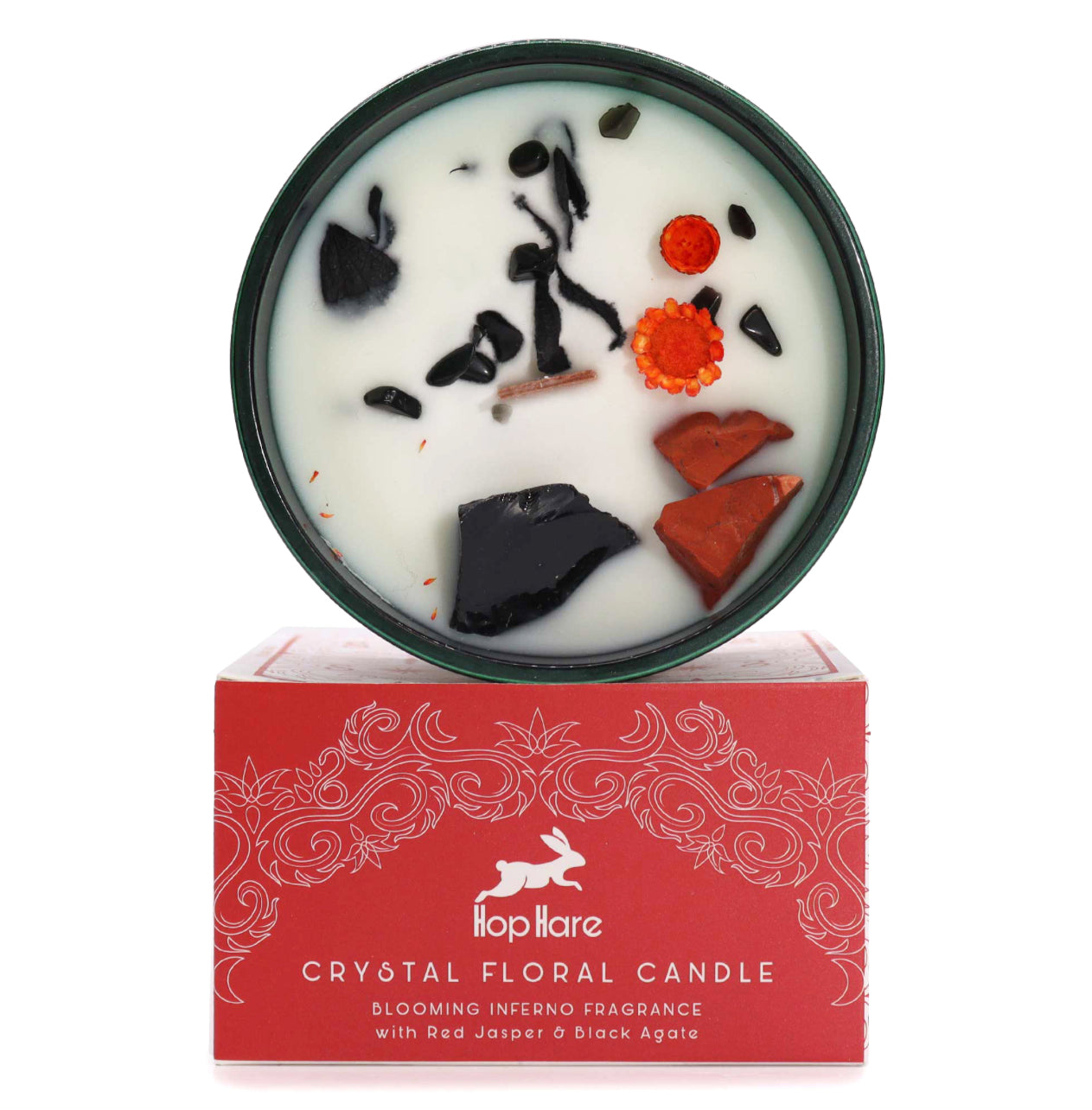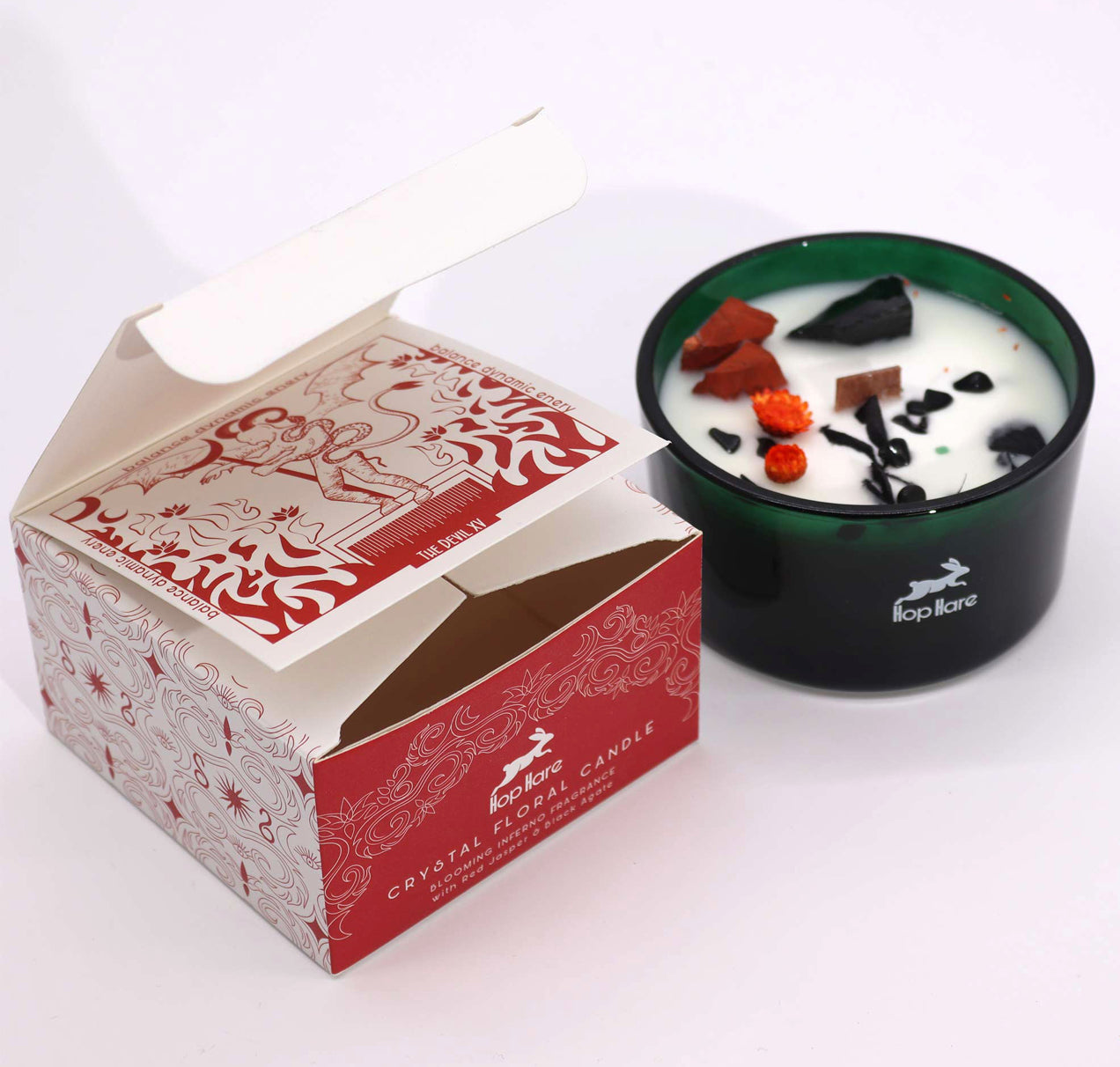 Kiekviena „Hop Hare" krištolo magijos žvakė yra tikras šedevras – įdėta į elegantišką tamsiai žalią stiklinį indą. Viduje rasite kristalą, apibarstytą smulkesnių kristalų drožlėmis ir subtiliais sausais žiedais – tikrą gamtos stebuklų kompoziciją.