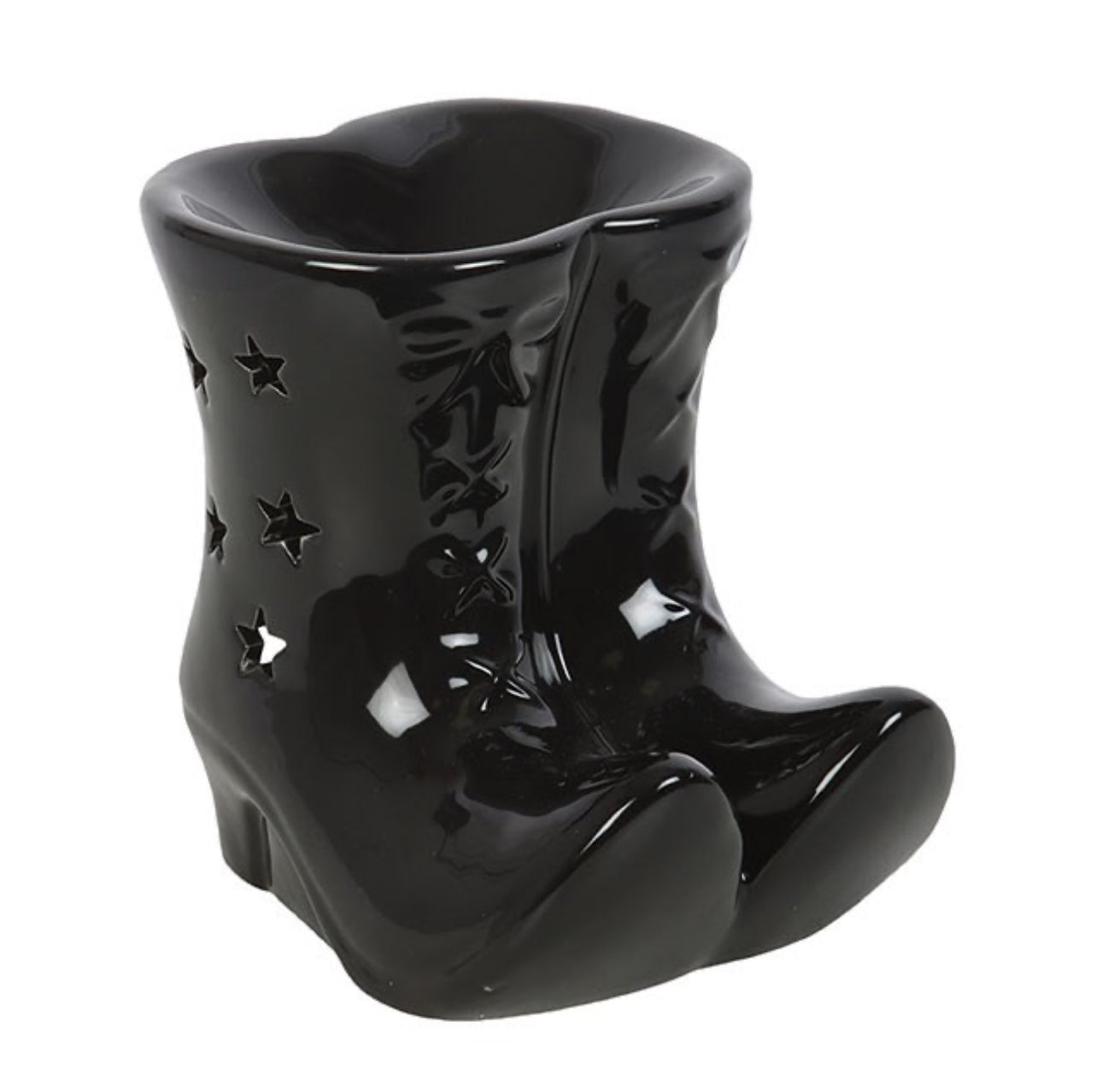 Suteikite savo erdvei kerėjimo žavesio su šiuo juodu keraminiu aliejaus degikliu, kurio forma primena klasikinius raganos batus ir kuris yra su žvaigždutėmis, kurios šviečia naudojant.