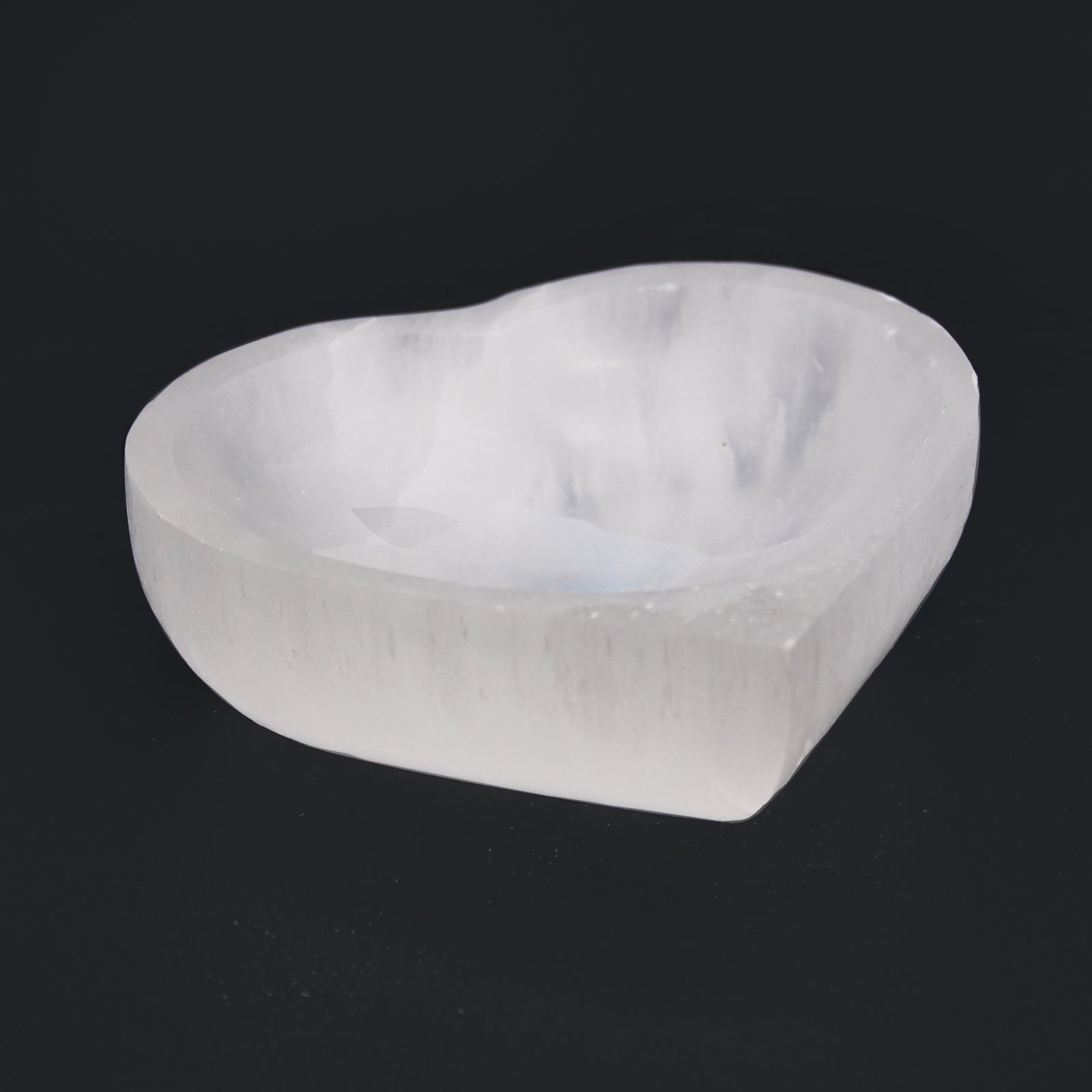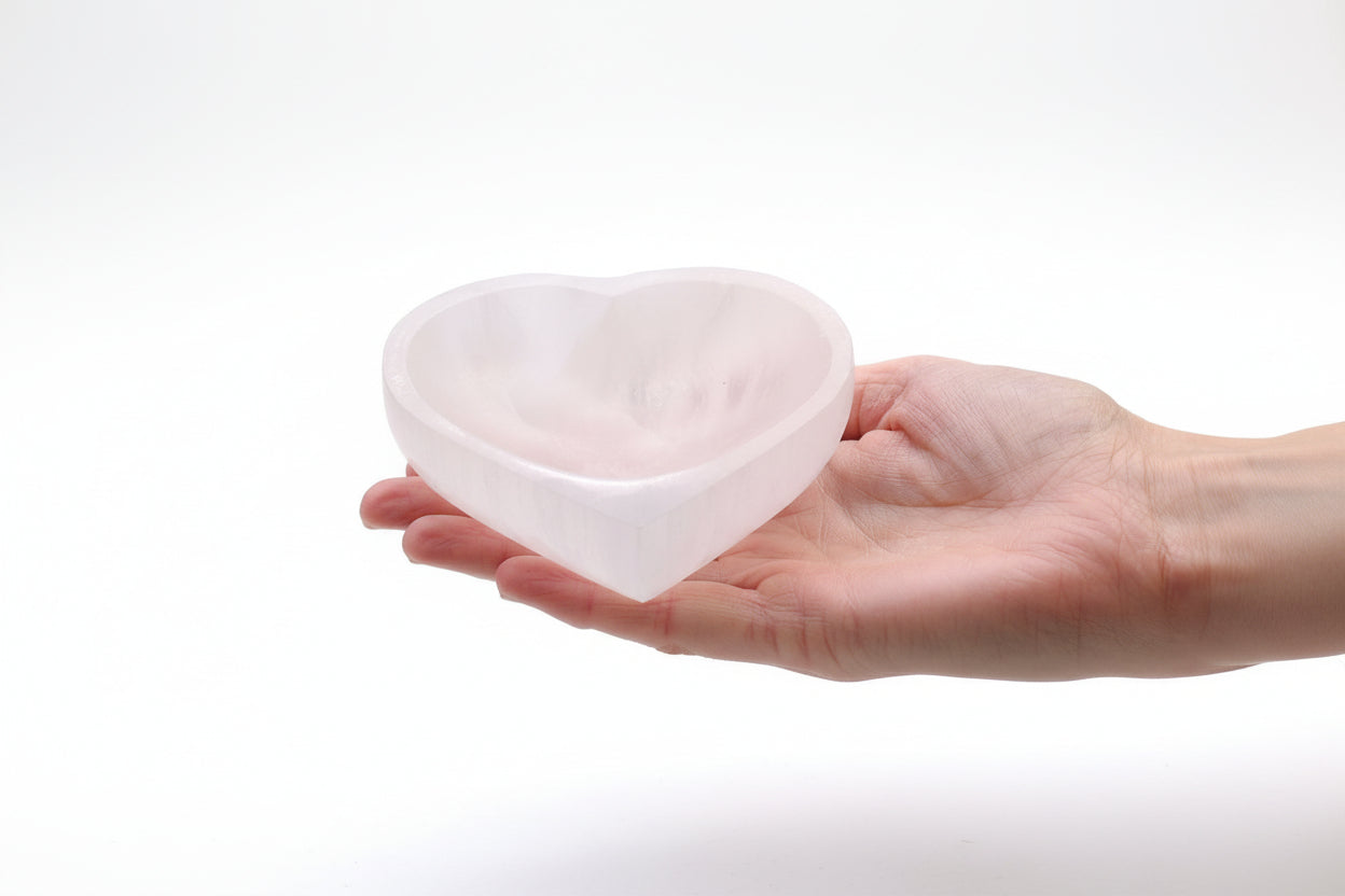 Elegantiškas 10 cm selenito dubenėlis širdies forma – sujungia selenito savybes su meilės ir užuojautos energija. Tobulas pasirinkimas širdies čakros darbui ir emociniam gydymui.