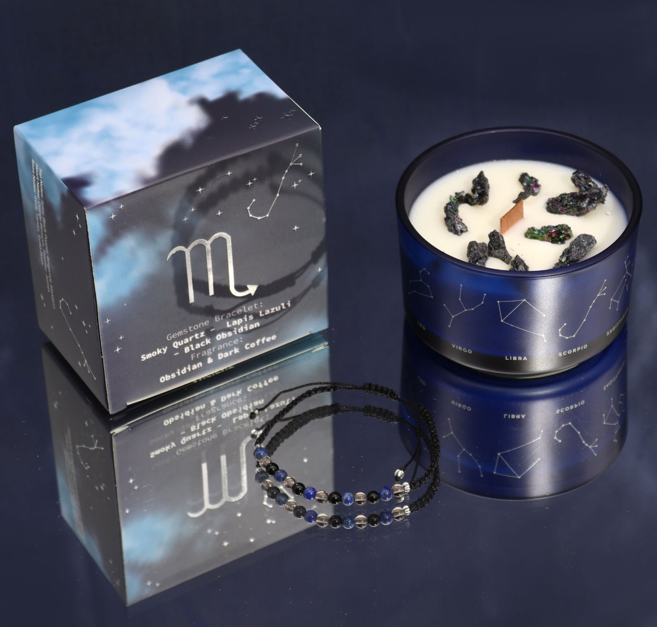 Šis žavus žvakės ir apyrankės derinys idealiai tinka savistabos, įgalinimo akimirkoms arba kaip prasminga dovana Skorpionui.