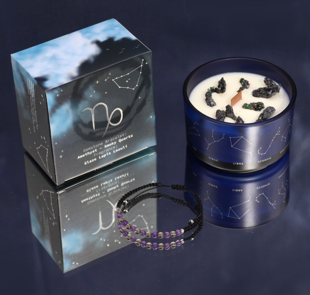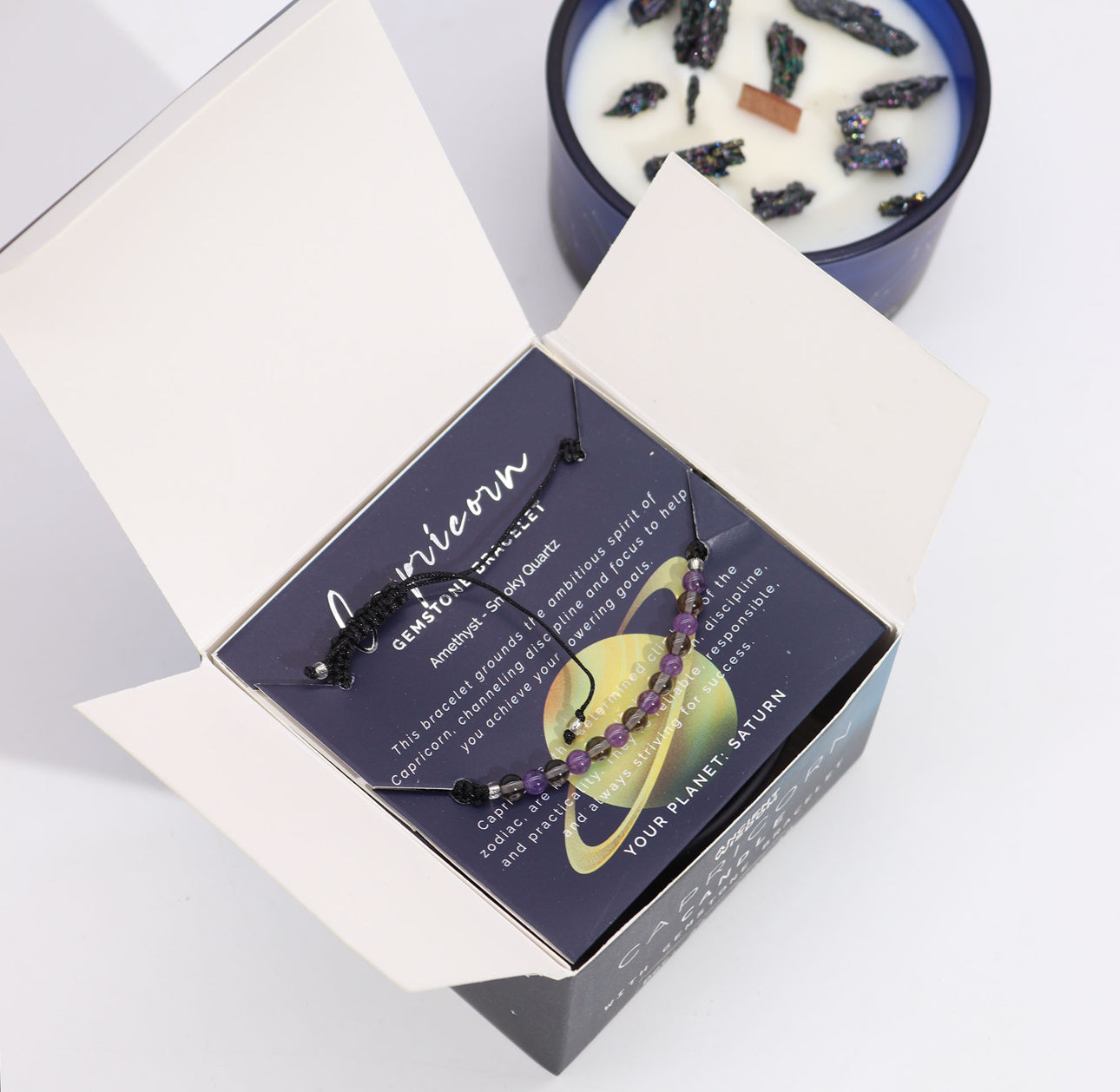 Šis elegantiškas žvakės ir apyrankės derinys idealiai tinka savirefleksijai, susikaupimui arba kaip prasminga dovana Ožiaragiui.