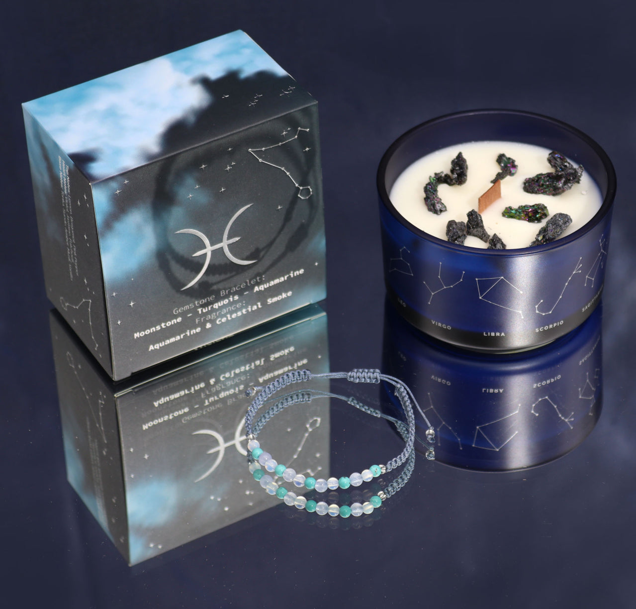 Šis magiškas žvakės ir apyrankės derinys idealiai tinka savęs priežiūrai, meditacijai arba kaip prasminga dovana Žuvims.