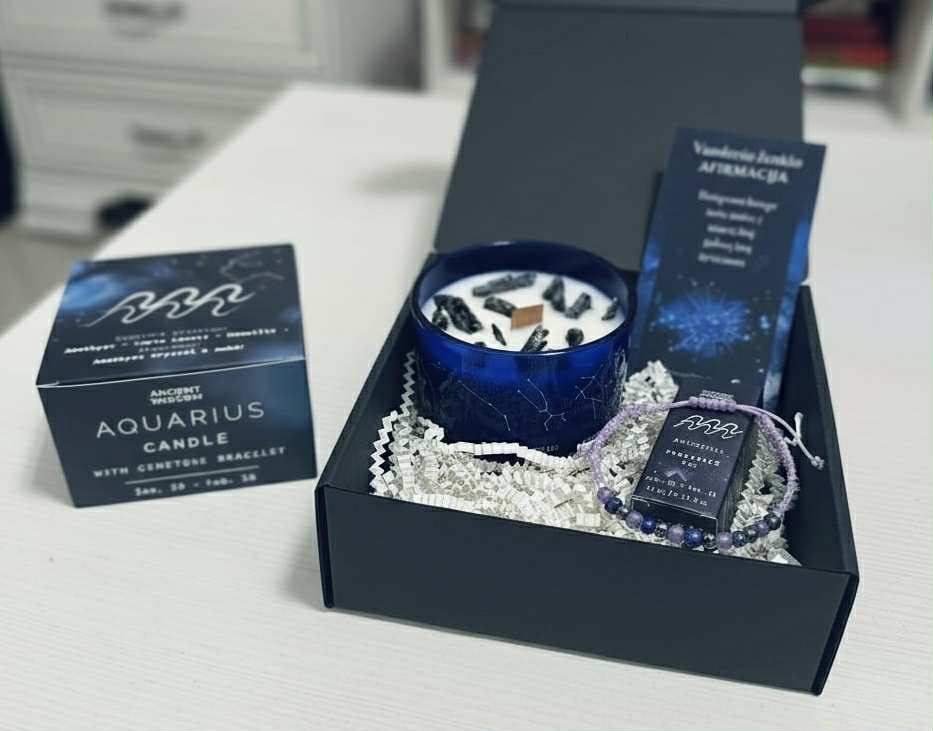 Šis magiškas rinkinys idealiai tinka savęs priežiūrai, meditacijai arba kaip prasminga dovana Vandeniui. Įneškite Vandenio novatoriškumo ir vizijos energiją į savo erdvę.