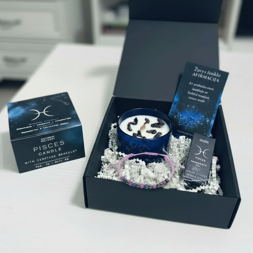 Šis magiškas rinkinys idealiai tinka savęs priežiūrai, meditacijai arba kaip prasminga dovana Žuvims. Įneškite Žuvų svajingumo ir intuicijos energiją į savo erdvę.