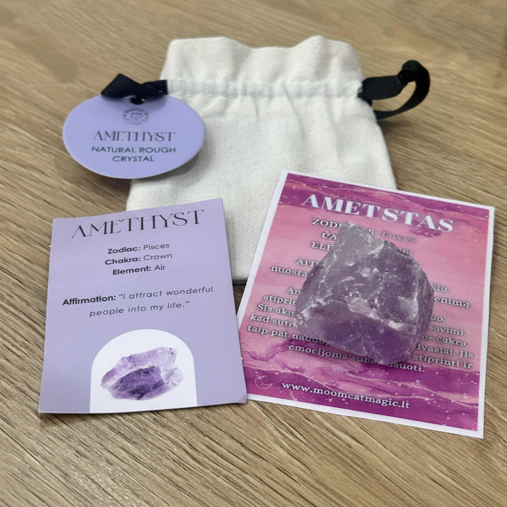 Neapdorotas ametisto kristalas: Tikrasis „Gydytojo akmuo“, žinomas dėl savo gebėjimo raminti emocijas, mažinti nerimą ir saugoti nuo negatyvių energijų.