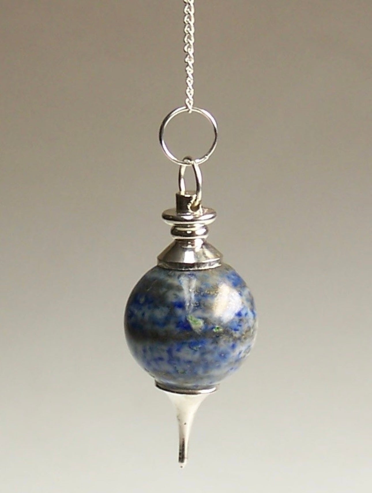 Kiekviena švytuoklė yra unikali dėl natūralių Lapis Lazuli akmens savybių – spalvos atspalviai ir auksiniai įtraukimai gali šiek tiek skirtis, todėl jūsų švytuoklė bus tikrai ypatinga.