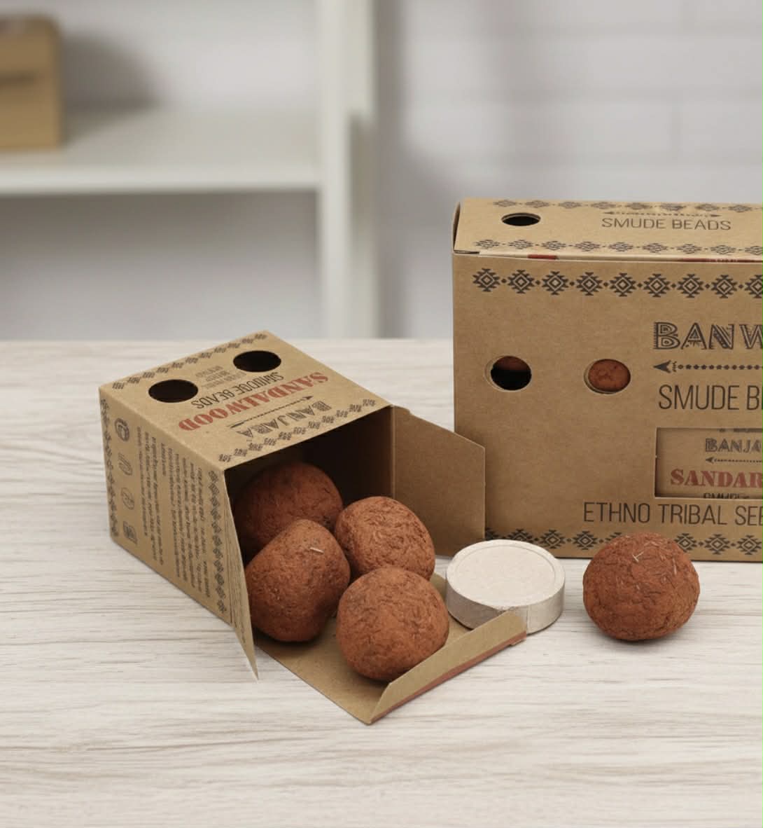 „Banjara Smudge Beads" santalmedžio karoliukai pagaminti Indijoje naudojant suspaustas aromatines žoleles, dervas ir eterinius aliejus. Šie ekologiški karoliukai yra natūralus būdas išvalyti ir apvalyti erdves.