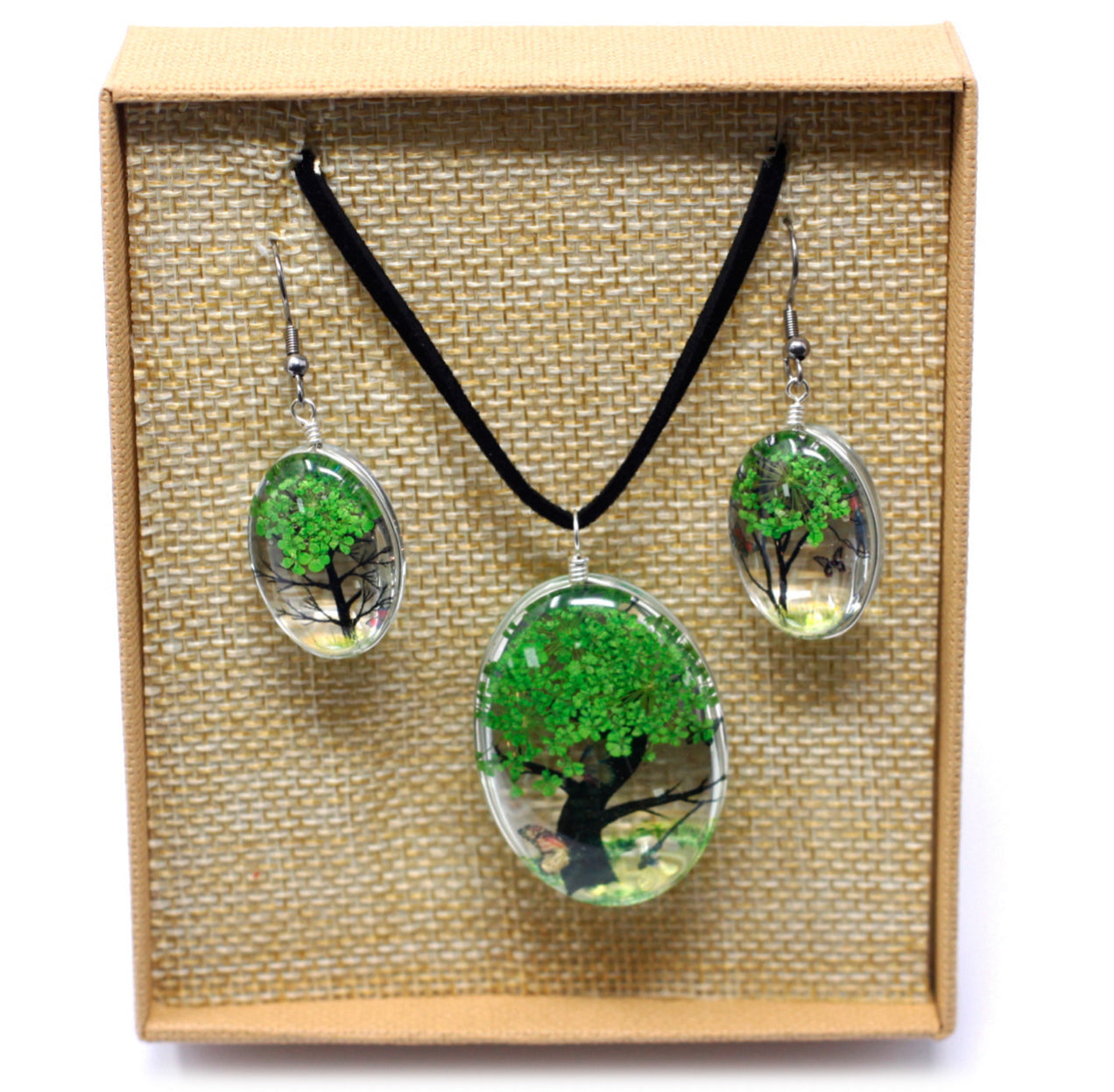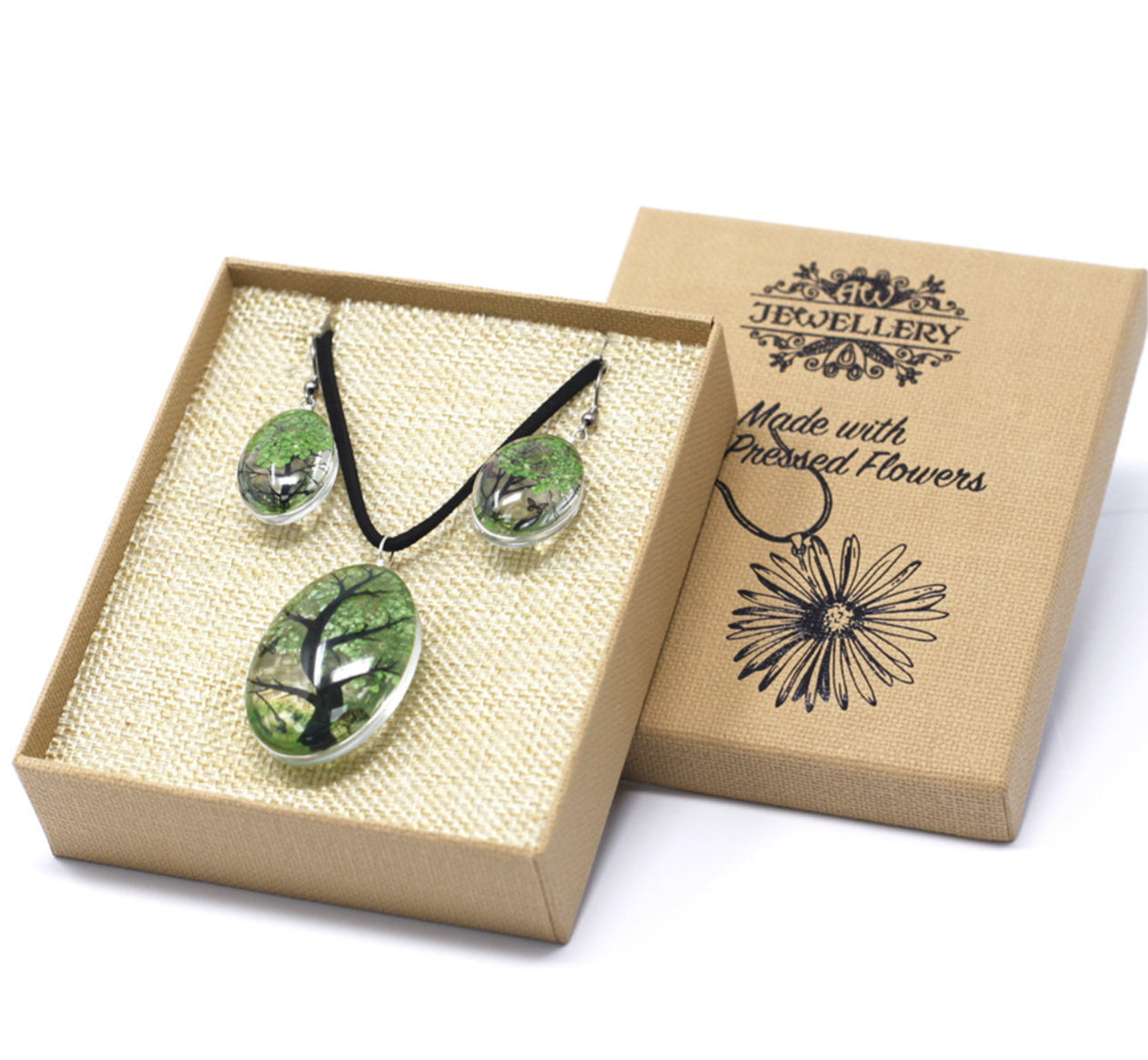 Apkabinkite unikalų gamtos grožį su mūsų išskirtine presuotų gėlių papuošalų kolekcija – elegantišku vėriniu ir derančiais auskarais.