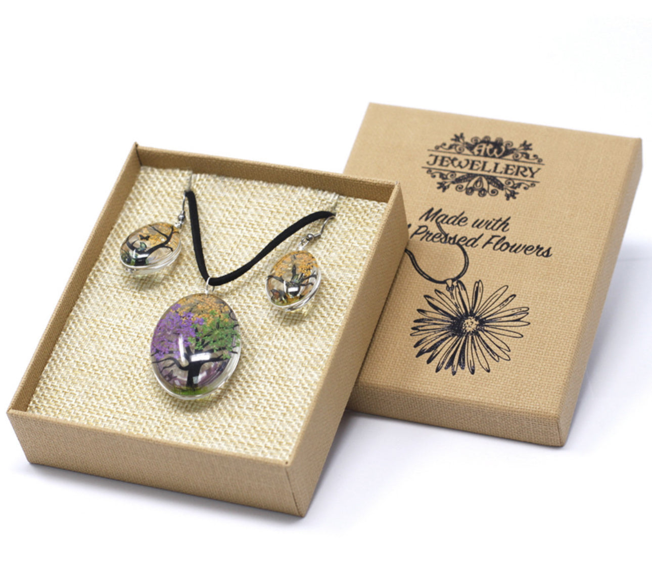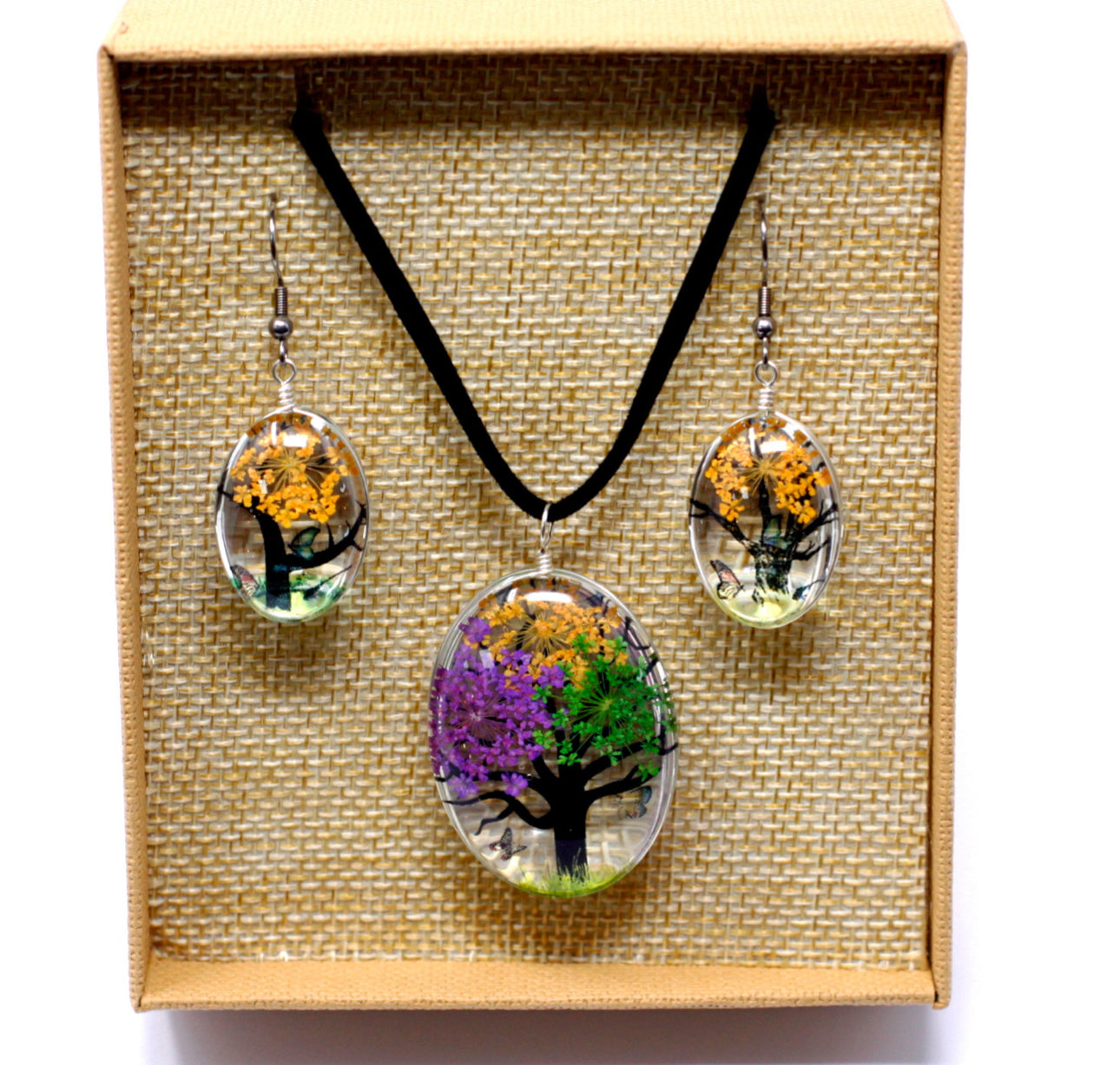 Apkabinkite unikalų gamtos grožį su mūsų išskirtine presuotų gėlių papuošalų kolekcija – elegantišku vėriniu ir derančiais auskarais.
