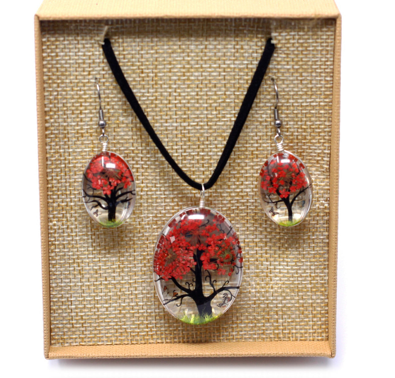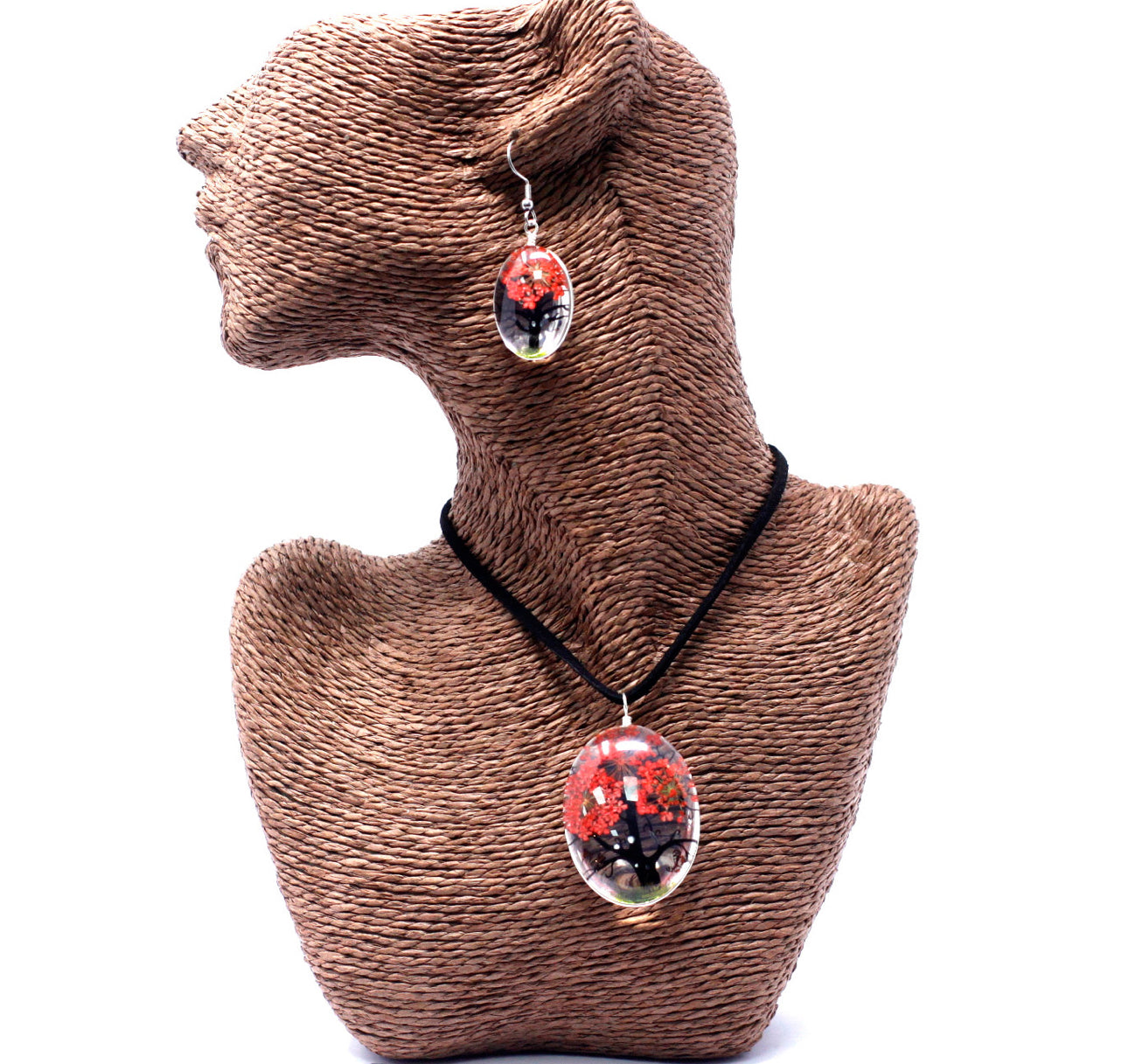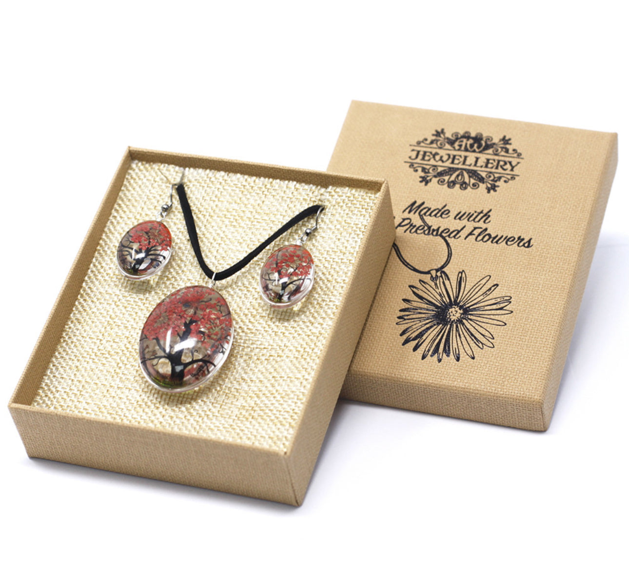 Apkabinkite unikalų gamtos grožį su mūsų išskirtine presuotų gėlių papuošalų kolekcija – elegantišku vėriniu ir derančiais auskarais.