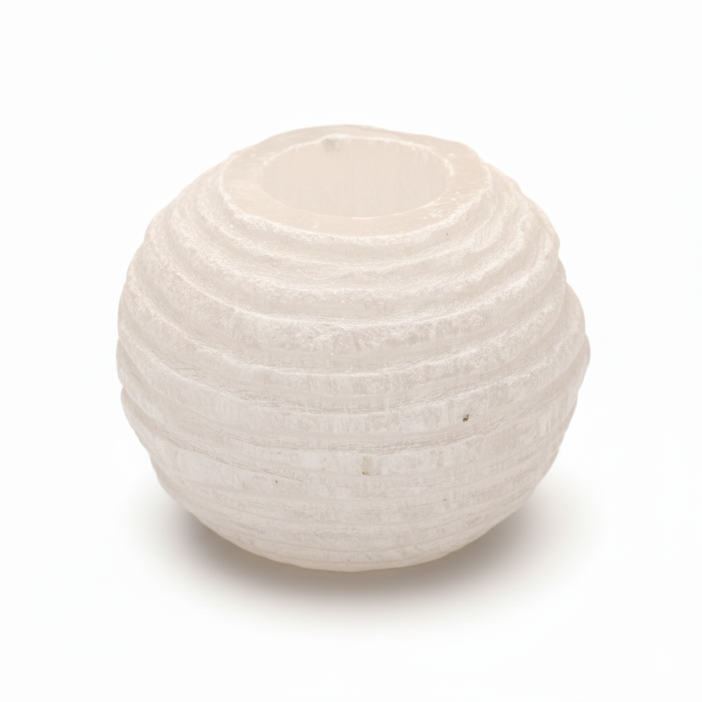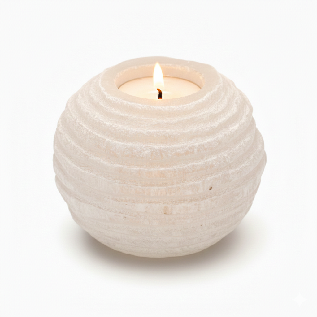 Unikali 8 cm selenito žvakidė sniego gniūžtės forma – sukuria magišką, ramią atmosferą, primenančią tylią žiemos naktį.